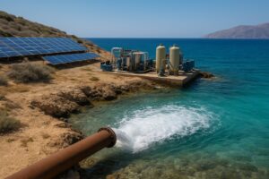 During the summer months, Greek islands rely heavily on desalination to cover excessive water needs. However, most desalination units operate with legacy technologies and without organized planning. The result: brine (υφάλμυρο συμπύκνωμα) — the highly concentrated salty water left over after desalination — is often discharged directly into the sea.